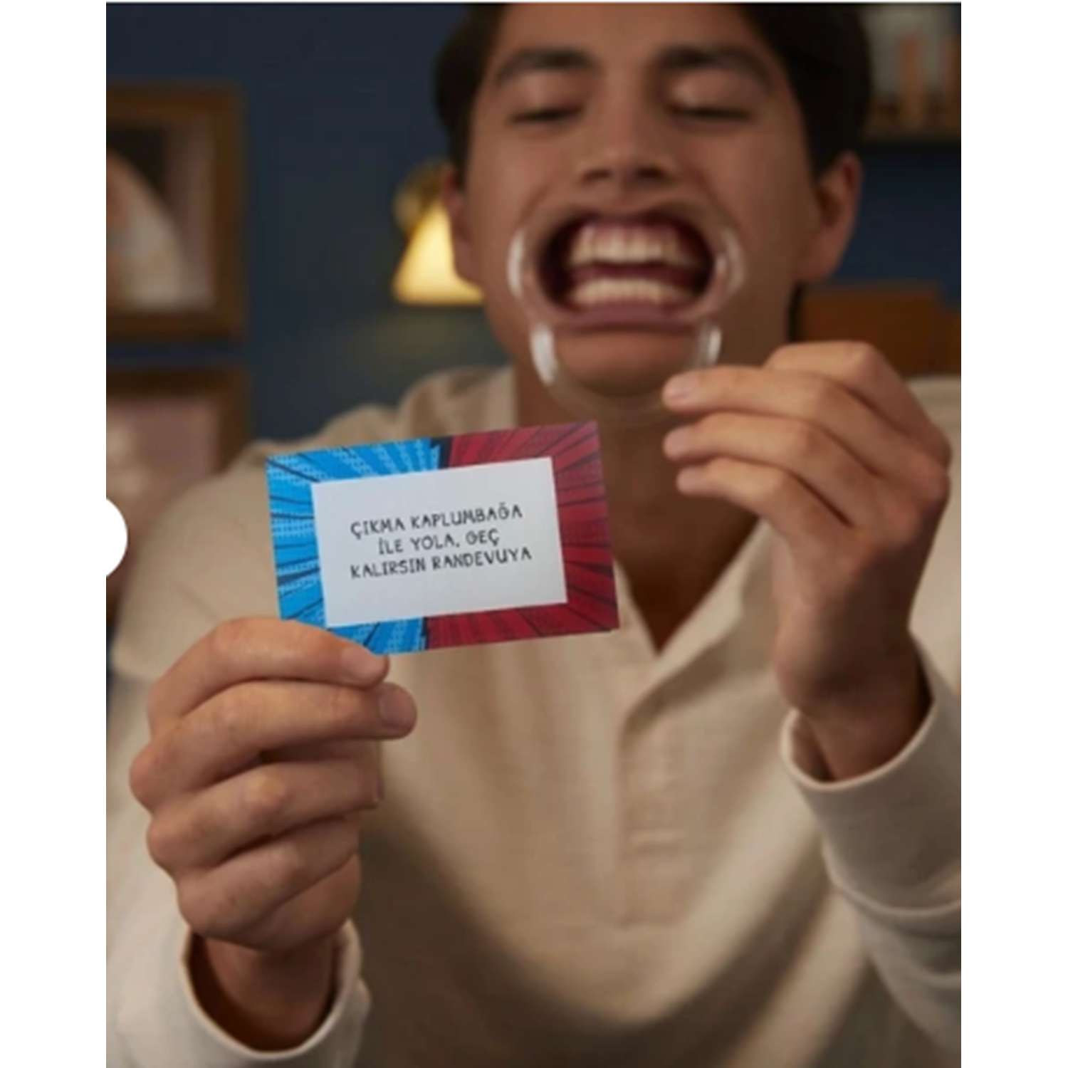 OYUNUN AMACI: Üzerinde yazanı doğru tahmin ettiğiniz kartları saklayın. Oyunun sonunda en çok kartı olan takım oyunu kazanır! HAYDİ OYNAYALIM! Sıra size gelince ağızlığı takın. (Sağ taraftaki AĞIZLIĞIN TAKILMASI bölümünü okuyun.) Başlamak için hazırsanız kum saatini çevirin. Destenin üstünden bir kart çekin ve yüksek sesle kartta yazanı okuyun. Kartı kazanmak için takım arkadaşlarınız söylediğiniz şeyi doğru tahmin etmeli. Takım arkadaşlarınız doğru tahmin edene kadar kartta yazanları tekrar edin. Ellerinizi kullanarak anlatabilirsiniz, ama mimik yapamazsınız. Takım arkadaşlarınız kartta yazanı doğru tahmin ederse, kartı önünüze koyun. Başka bir kart çekin ve süre bitene kadar oyunu oynamaya devam edin. Bir kartı pas geçebilirsiniz ama pas geçtiğiniz her kartı diğer takım kazanmış sayılır. Süreniz sona erince ağızlığı çıkarın. Takımınızın kazandığı kartları saklayın ve pas geçtiğiniz kartları diğer takıma verin. Şimdi sıra diğer takımda... Her oyuncu iki kez oynadıktan sonra oyun sona erer. KAZANAN: Takımınızın kartlarını sayın. En çok kartı olan takım oyunu kazanır!