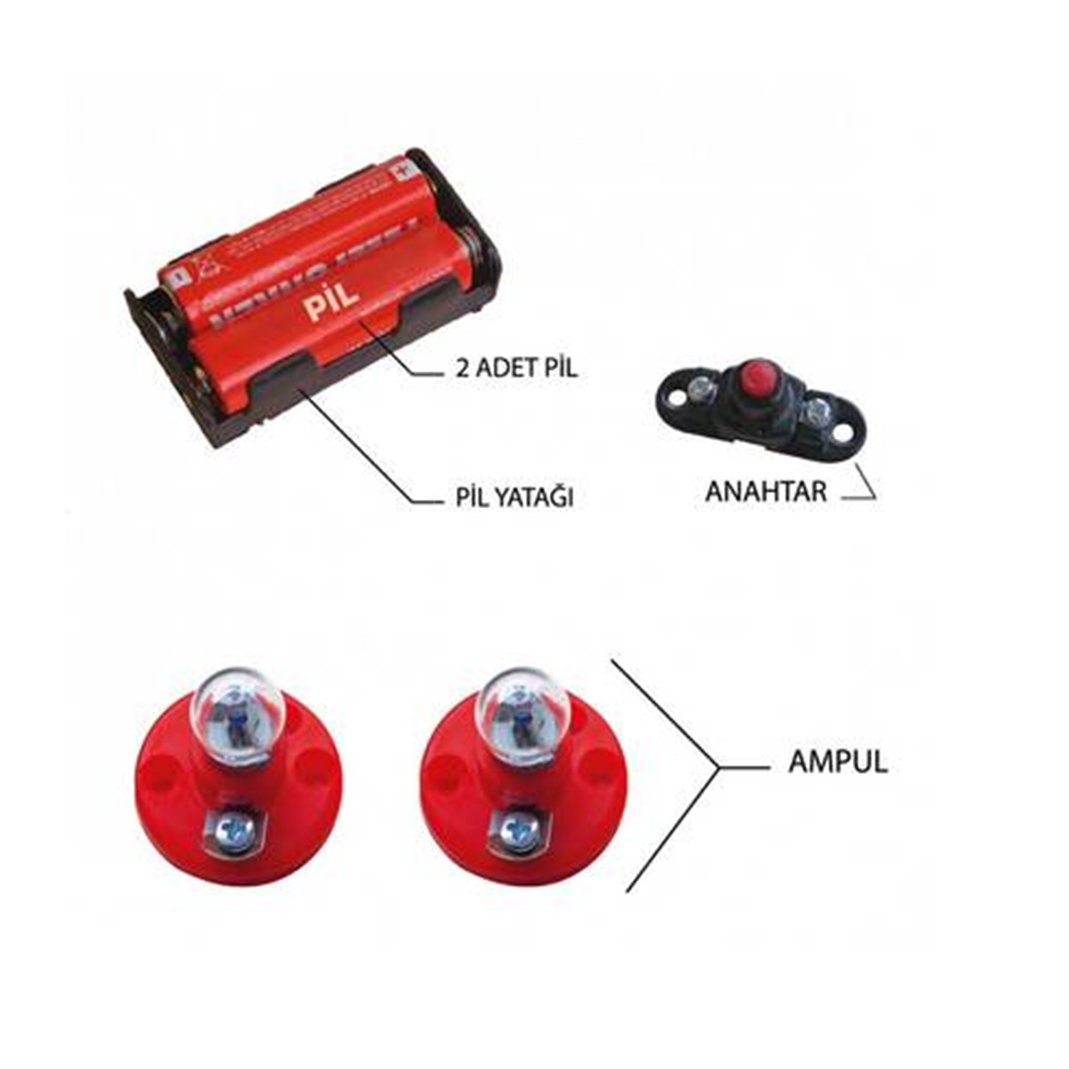 ÜRÜN ÖZELLİKLERİ / İÇİNDEKİLER : 2 Adet pil, 1 Adet Anahtar, 2 Adet Duy, 2 Adet Ampul, İletken Kablo, Pil yatağı