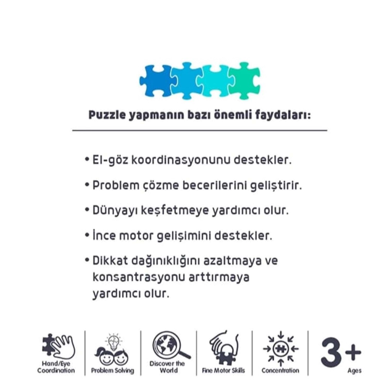 Puzzle oyuncaklar; çocuğunuzun görsel hafızasını geliştirir, neden sonuç ilişkisini kurma, duyusal gelişim, sınıflandırma, sıralama ve el-göz koordinasyonunun gelişmesine yardımcı olmaktadır.