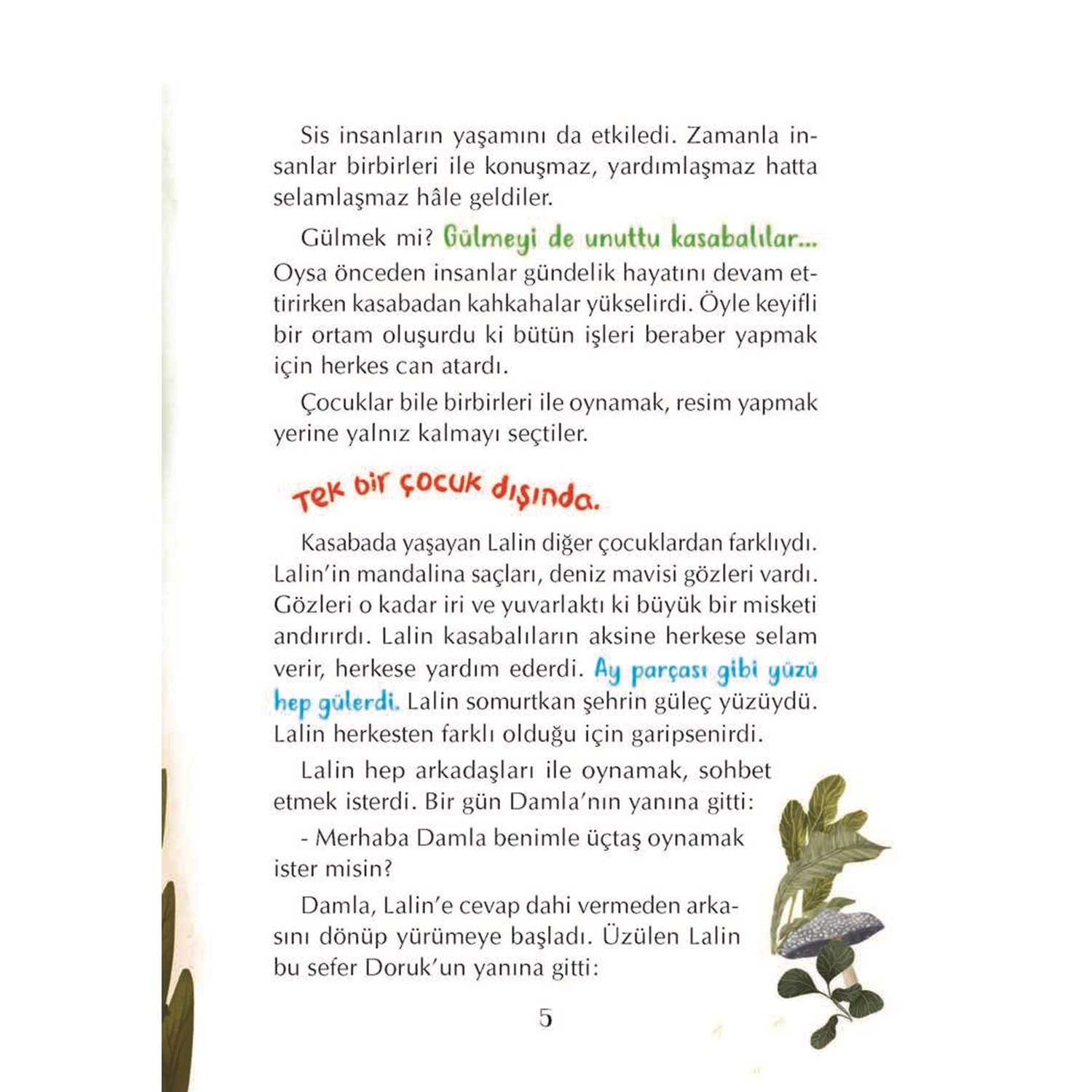 Sevgi dolu ve neşeli biri olan Lalin, kasabanın hâline çok üzülüyordu. Çünkü gördüğü herkesin yüzü çok asıktı. Dayanamadı, yerinde duramaz oldu. Hayvanlardan doğaya, doğadan tüm ormana, ormandan kasabaya bulaşan bu mutsuzluğun peşine düştü.