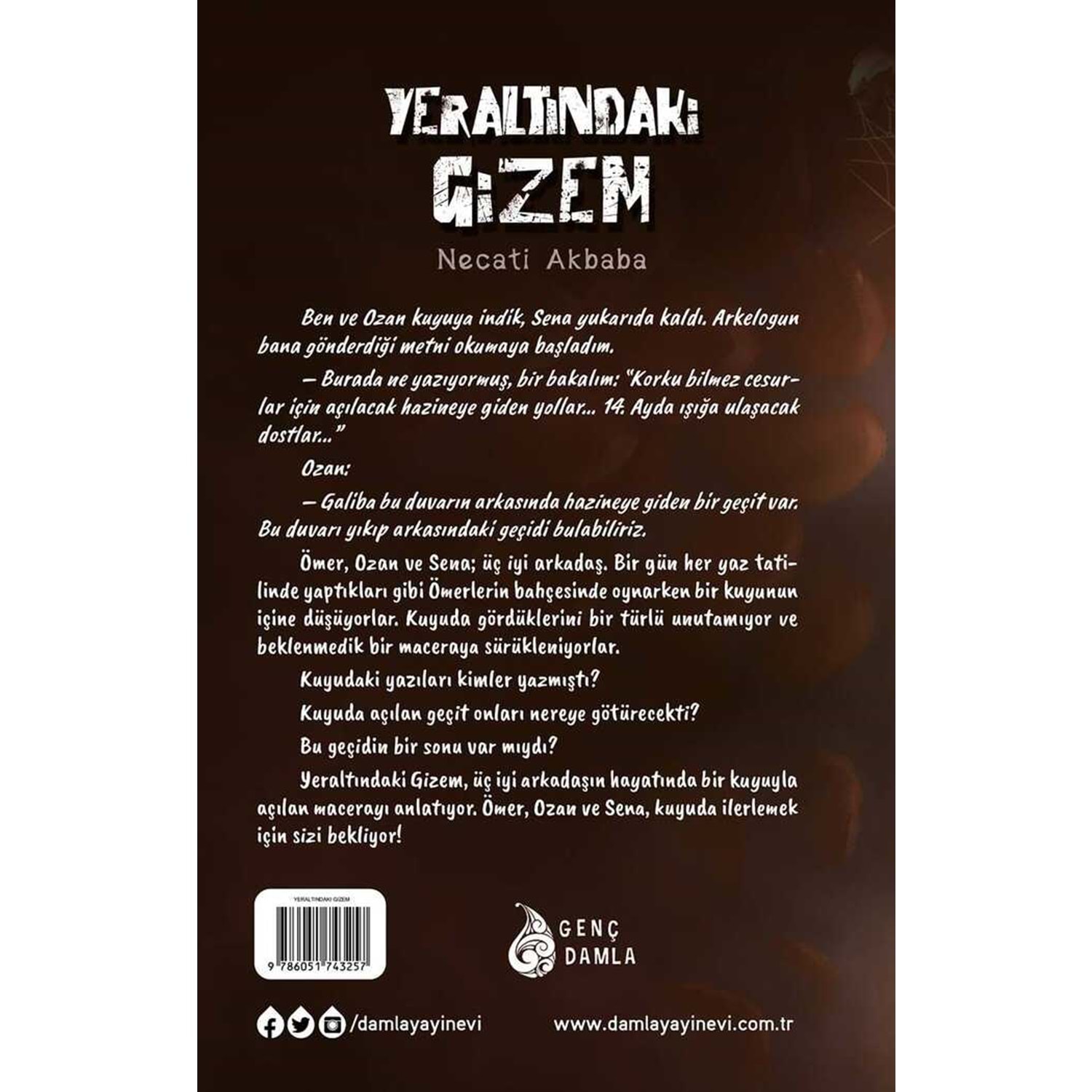 Ömer, Ozan ve Sena üç arkadaştır. Bir gün Ömerlerin bahçesinde oyun oynarlarken bir kuyuya rastlarlar. Kuyu; onları keşfedilmemiş bir yeraltı dünyasına götürür ve orada çeşitli maceralar yaşarlar. Yeraltı şehrinde yaşayanlar kimlerdi? Ömer, Ozan ve Sena geri dönebilecek miydi? Ailelerine tekrar kavuşacaklar mıydı? Haydi, yeraltındaki gizemi birlikte çözelim. TÜR / TEMA • Macera, Gizem, Korku, Keşif, Yeraltı Dünyası ETİKETLER • Yeraltı, Gizem, Korku, Macera, Oyun, Arkadaşlık, Yardımlaşma, Analitik Düşünce