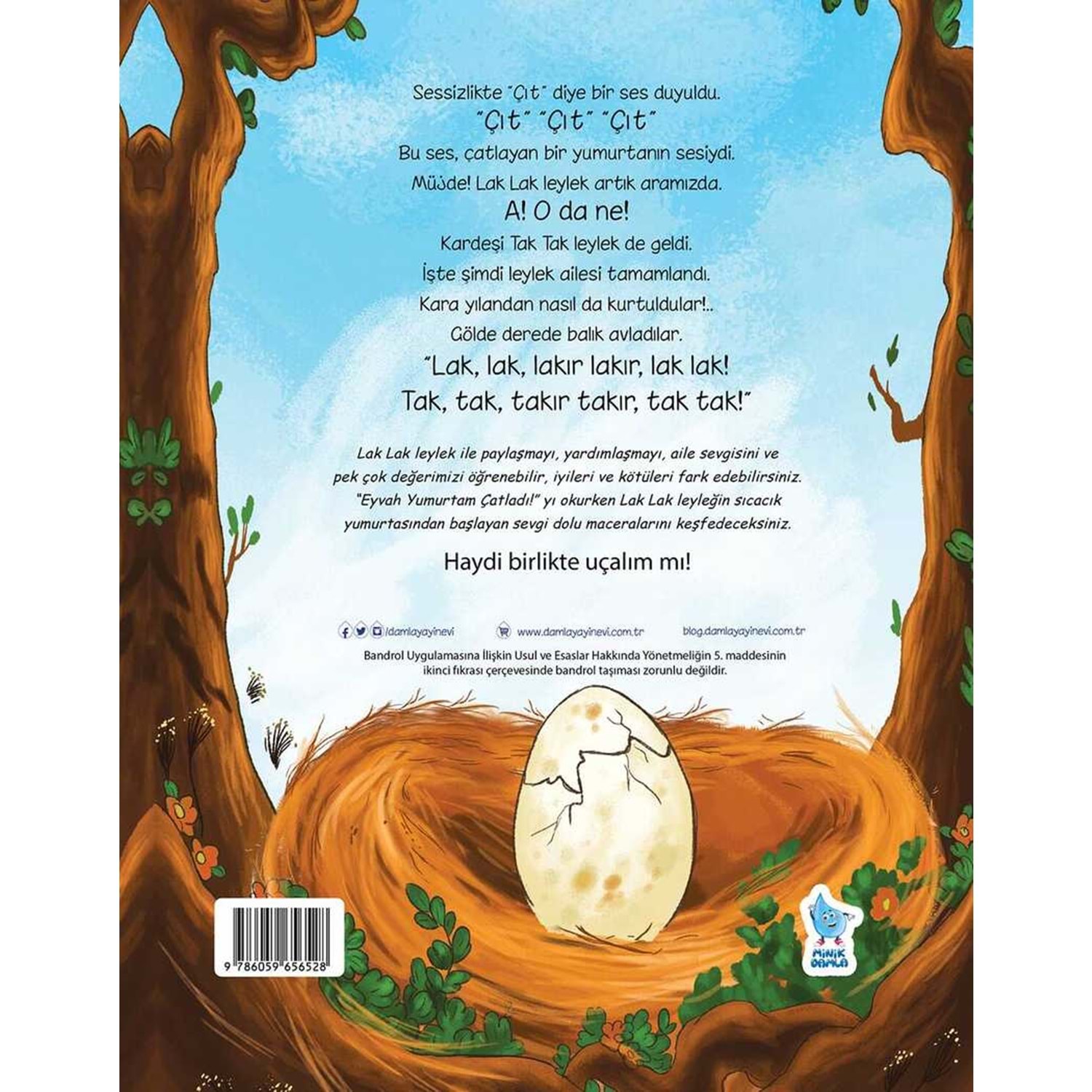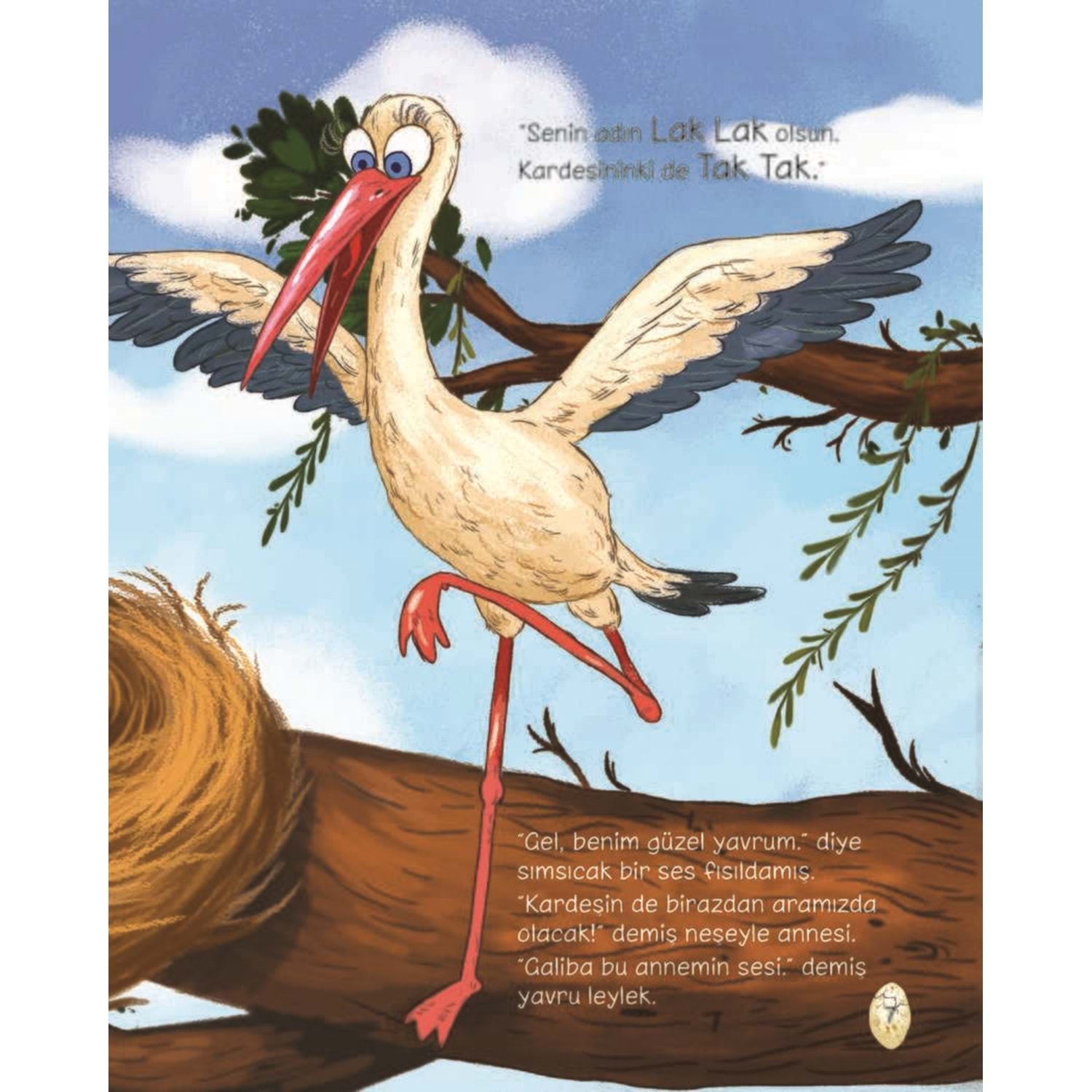 Sessizlikte “Çıt” diye bir ses duyuldu. “Çıt” “Çıt” “Çıt” Bu ses, çatlayan bir yumurtanın sesiydi. Müjde! Lak Lak leylek artık aramızda. A! O da ne! Kardeşi Tak Tak leylek de geldi. İşte şimdi leylek ailesi tamamlandı. Kara yılandan nasıl da kurtuldular!.. Gölde derede balık avladılar. “Lak, lak, lakır lakır, lak lak! Tak, tak, takır takır, tak tak!” Lak Lak leylek ile paylaşmayı, yardımlaşmayı, aile sevgisini ve pek çok değerimizi öğrenebilir, iyileri ve kötüleri fark edebilirsiniz. “Eyvah Yumurtam Çatladı!”yı okurken Lak Lak leyleğin sıcacık yumurtasından başlayan sevgi dolu maceralarını keşfedeceksiniz. Haydi birlikte uçalım mı!